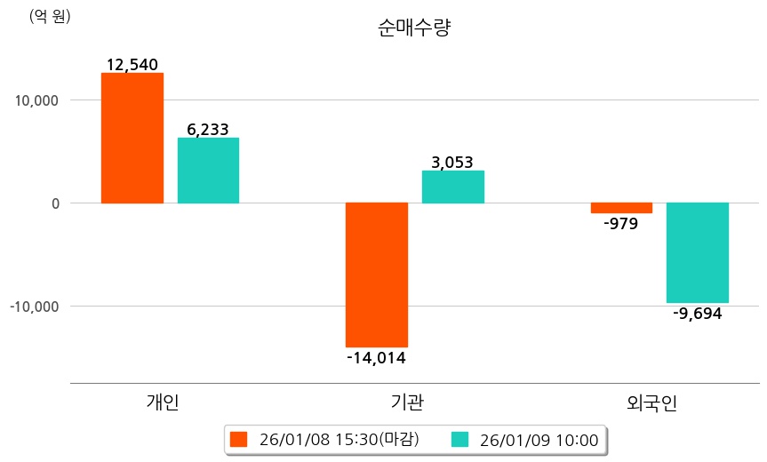 투자자별 동향을 살펴보면 기관은 3,053억 원 순매수했으며, 외국인은 9,694억 원 순매도했다. 개인은 6,233억 원 순매수했다.