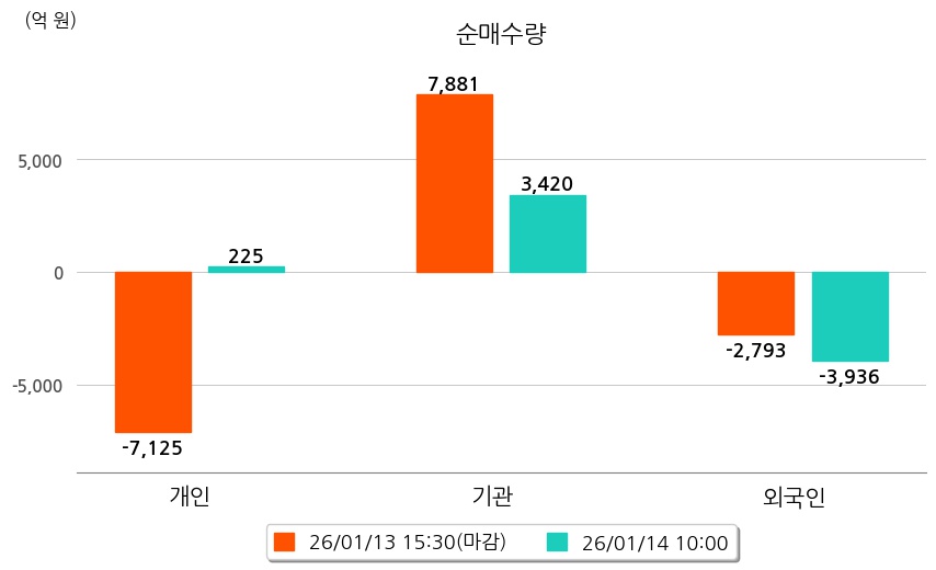 투자자별 동향을 살펴보면 기관은 3,420억 원 순매수했으며, 외국인은 3,936억 원 순매도했다. 개인은 225억 원 순매수했다.