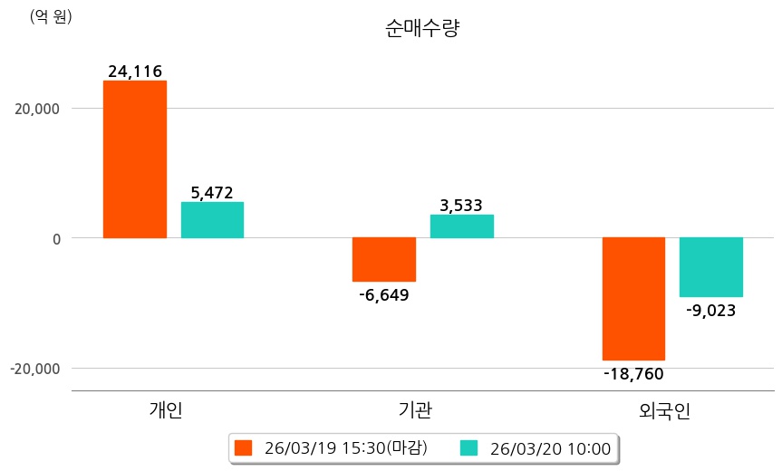 투자자별 동향을 살펴보면 기관은 3,533억 원 순매수했으며, 외국인은 9,023억 원 순매도했다. 개인은 5,472억 원 순매수했다.