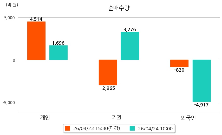 투자자별 동향을 살펴보면 기관은 3,276억 원 순매수했으며, 외국인은 4,917억 원 순매도했다. 개인은 1,696억 원 순매수했다.