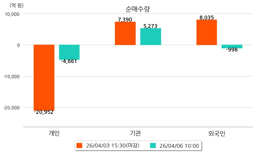투자자별 동향을 살펴보면 기관은 5,273억 원 순매수했으며, 외국인은 998억 원 순매도했다. 개인은 4,661억 원 순매도했다.