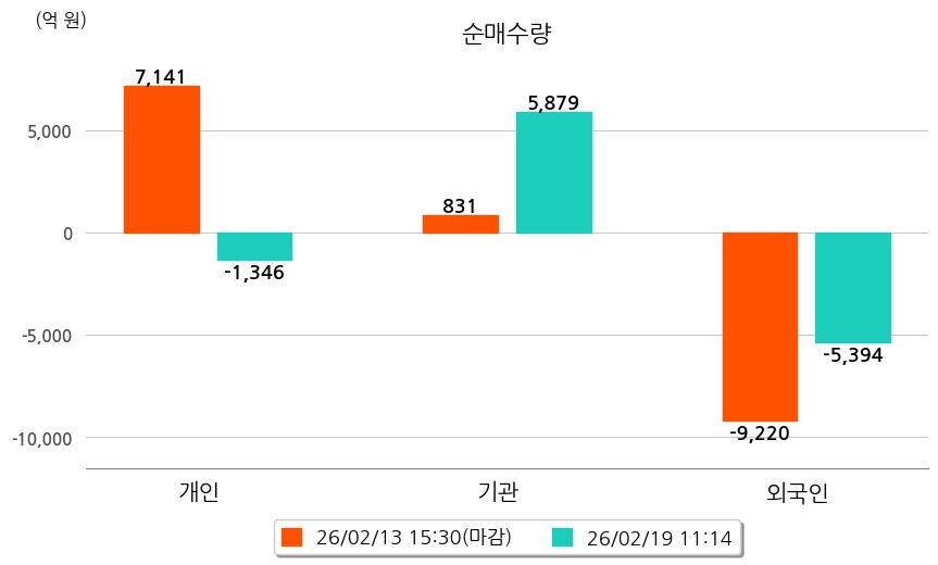 투자자별 동향을 살펴보면 기관은 5,879억 원 순매수했으며, 외국인은 5,394억 원 순매도했다. 개인은 1,346억 원 순매도했다.