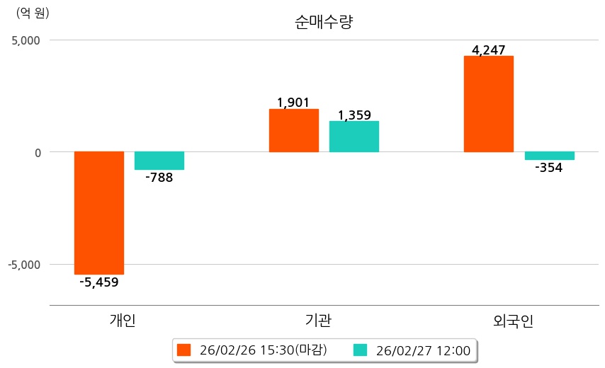 투자자별 동향을 살펴보면 기관은 1,359억 원 순매수했으며, 외국인은 354억 원 순매도했다. 개인은 788억 원 순매도했다.