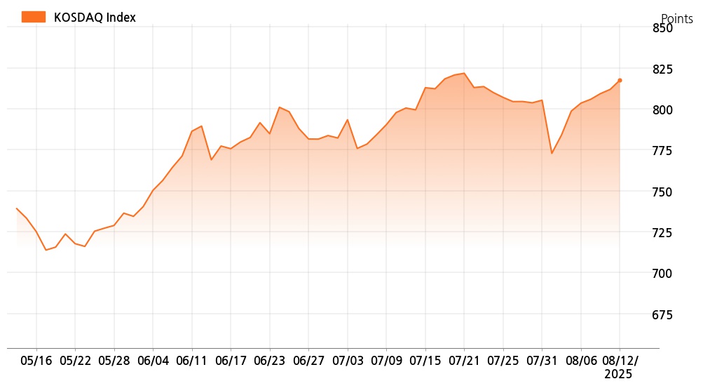 12일 정오 현재 코스닥(817.51p, 5.66p, +0.70%)는 외국인 매수가 늘면서 상승세를 보이고 있다.