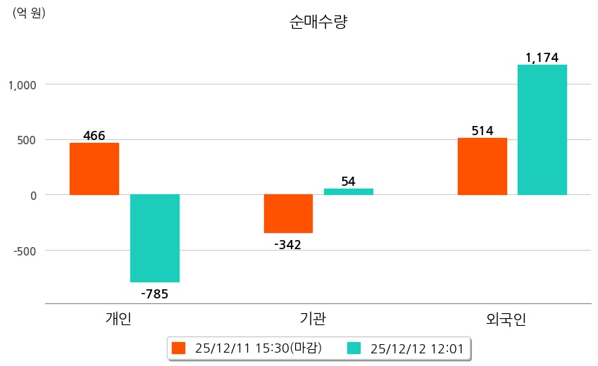 투자자별 동향을 살펴보면 기관은 54억 원 순매수했으며, 외국인은 1,174억 원 순매수했다. 개인은 785억 원 순매도했다.