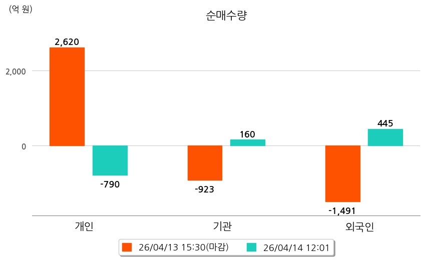 투자자별 동향을 살펴보면 기관은 160억 원 순매수했으며, 외국인은 445억 원 순매수했다. 개인은 790억 원 순매도했다.
