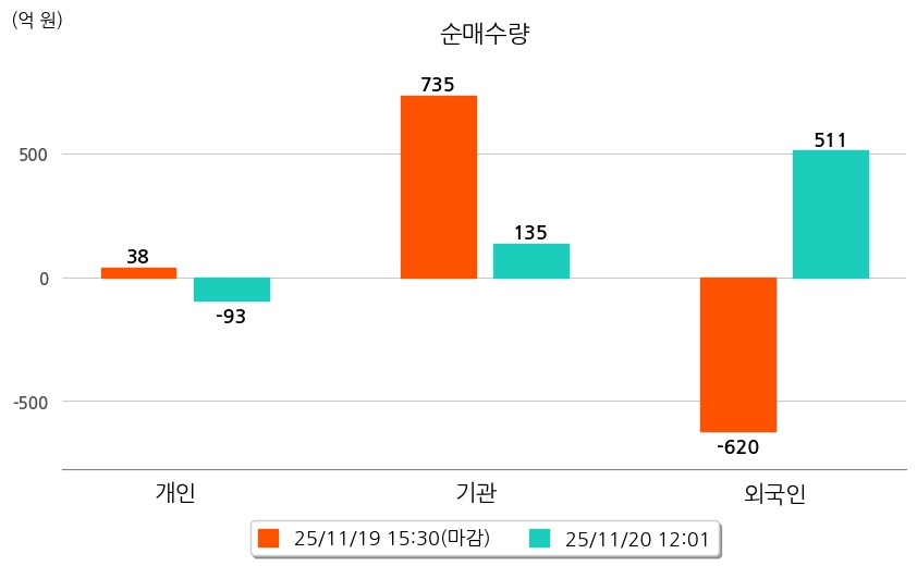 투자자별 동향을 살펴보면 기관은 135억 원 순매수했으며, 외국인은 511억 원 순매수했다. 개인은 93억 원 순매도했다.