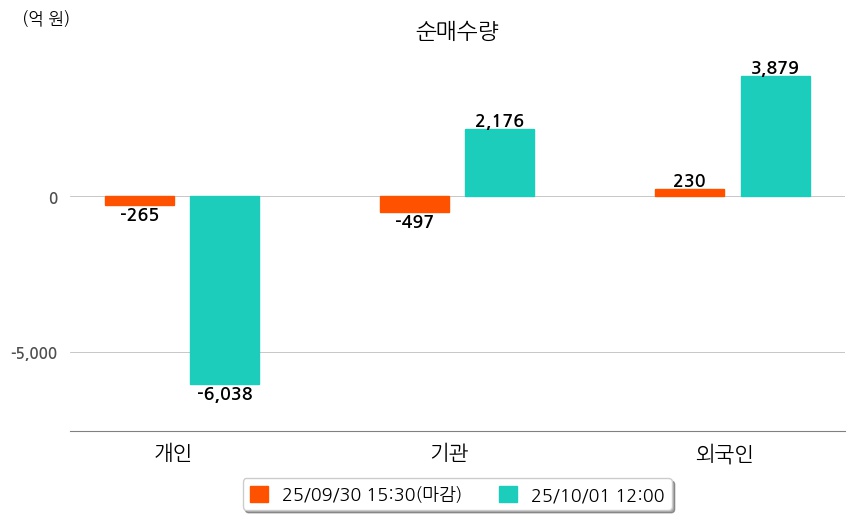 투자자별 동향을 살펴보면 기관은 2,176억 원 순매수했으며, 외국인은 3,879억 원 순매수했다. 개인은 6,038억 원 순매도했다.