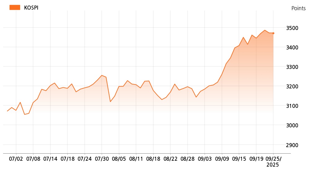 25일 정오 현재 코스피(3,471.81p, 0.33p, -0.01%)는 개인 매도가 늘면서 하락세를 보이고 있다.