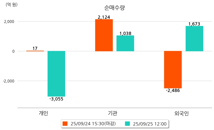 투자자별 동향을 살펴보면 기관은 1,038억 원 순매수했으며, 외국인은 1,673억 원 순매수했다. 개인은 3,055억 원 순매도했다.