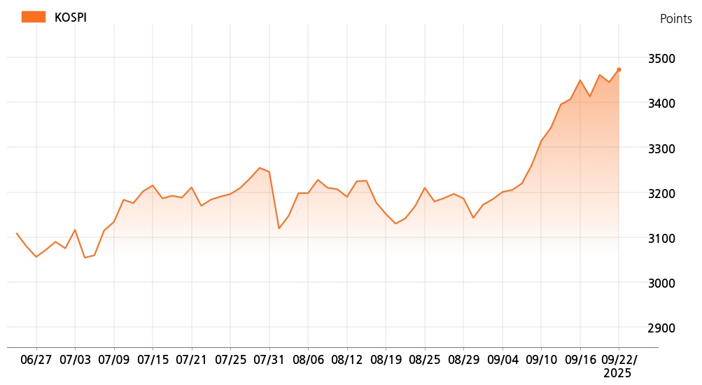 22일 정오 현재 코스피(3,474.60p, 29.36p, +0.85%)는 외국인 매수가 늘면서 상승세를 보이고 있다.
