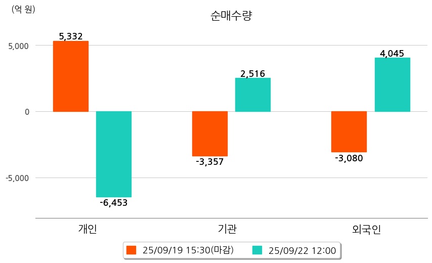 투자자별 동향을 살펴보면 기관은 2,516억 원 순매수했으며, 외국인은 4,045억 원 순매수했다. 개인은 6,453억 원 순매도했다.
