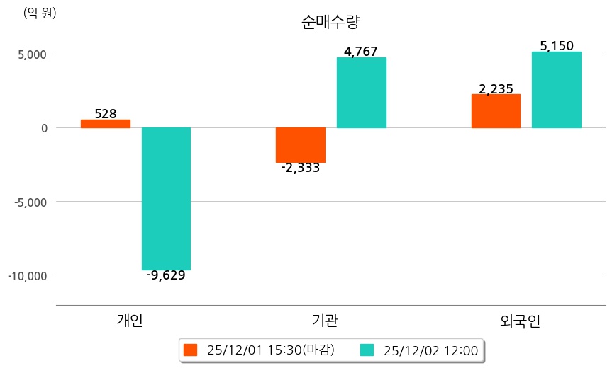 투자자별 동향을 살펴보면 기관은 4,767억 원 순매수했으며, 외국인은 5,150억 원 순매수했다. 개인은 9,629억 원 순매도했다.
