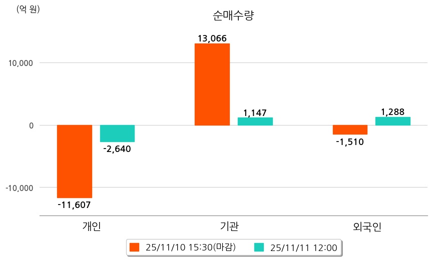 투자자별 동향을 살펴보면 기관은 1,147억 원 순매수했으며, 외국인은 1,288억 원 순매수했다. 개인은 2,640억 원 순매도했다.