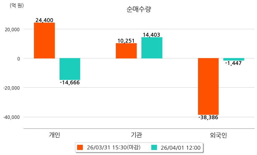 투자자별 동향을 살펴보면 기관은 14,403억 원 순매수했으며, 외국인은 1,447억 원 순매도했다. 개인은 14,666억 원 순매도했다.