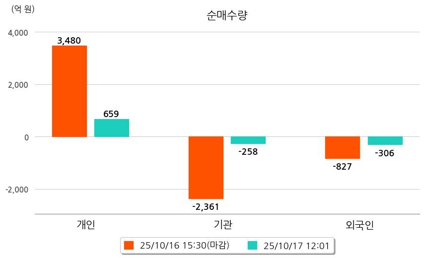 투자자별 동향을 살펴보면 기관은 258억 원 순매도했으며, 외국인은 306억 원 순매도했다. 개인은 659억 원 순매수했다.