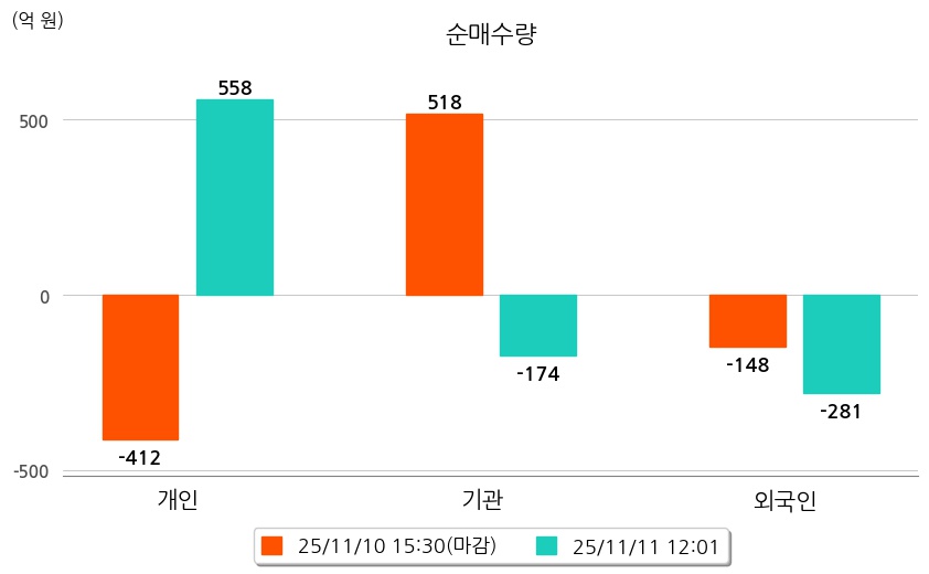투자자별 동향을 살펴보면 기관은 174억 원 순매도했으며, 외국인은 281억 원 순매도했다. 개인은 558억 원 순매수했다.