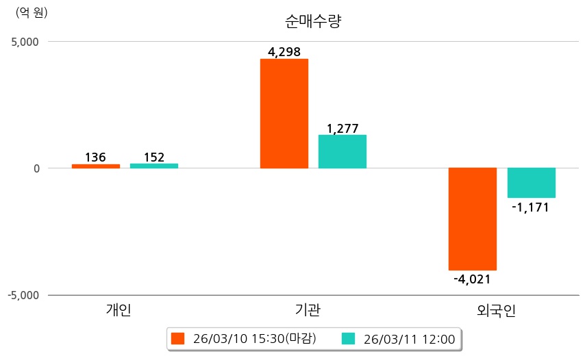 투자자별 동향을 살펴보면 기관은 1,277억 원 순매수했으며, 외국인은 1,171억 원 순매도했다. 개인은 152억 원 순매수했다.
