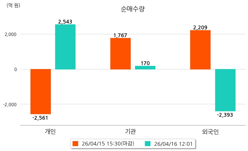 투자자별 동향을 살펴보면 기관은 170억 원 순매수했으며, 외국인은 2,393억 원 순매도했다. 개인은 2,543억 원 순매수했다.