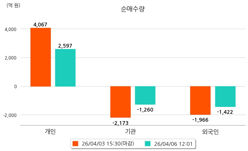 투자자별 동향을 살펴보면 기관은 1,260억 원 순매도했으며, 외국인은 1,422억 원 순매도했다. 개인은 2,597억 원 순매수했다.
