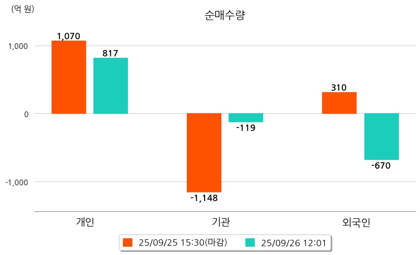 투자자별 동향을 살펴보면 기관은 119억 원 순매도했으며, 외국인은 670억 원 순매도했다. 개인은 817억 원 순매수했다.