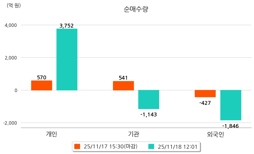 투자자별 동향을 살펴보면 기관은 1,143억 원 순매도했으며, 외국인은 1,846억 원 순매도했다. 개인은 3,752억 원 순매수했다.
