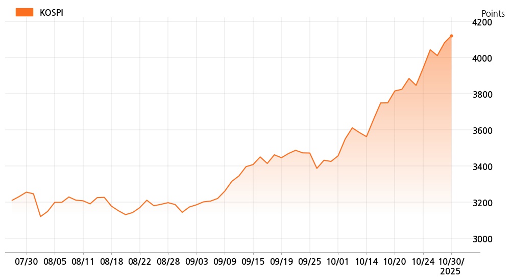 30일 정오 현재 코스피(4,121.13p, 39.98p, +0.98%)는 개인 매수가 늘면서 상승세를 보이고 있다.