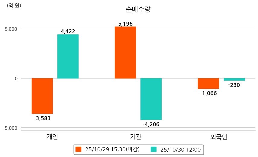 투자자별 동향을 살펴보면 기관은 4,206억 원 순매도했으며, 외국인은 230억 원 순매도했다. 개인은 4,422억 원 순매수했다.