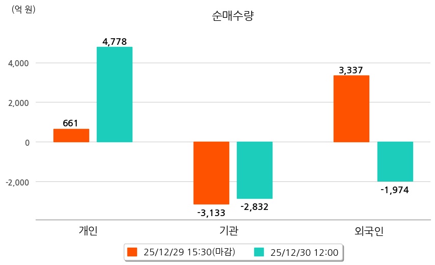 투자자별 동향을 살펴보면 기관은 2,832억 원 순매도했으며, 외국인은 1,974억 원 순매도했다. 개인은 4,778억 원 순매수했다.