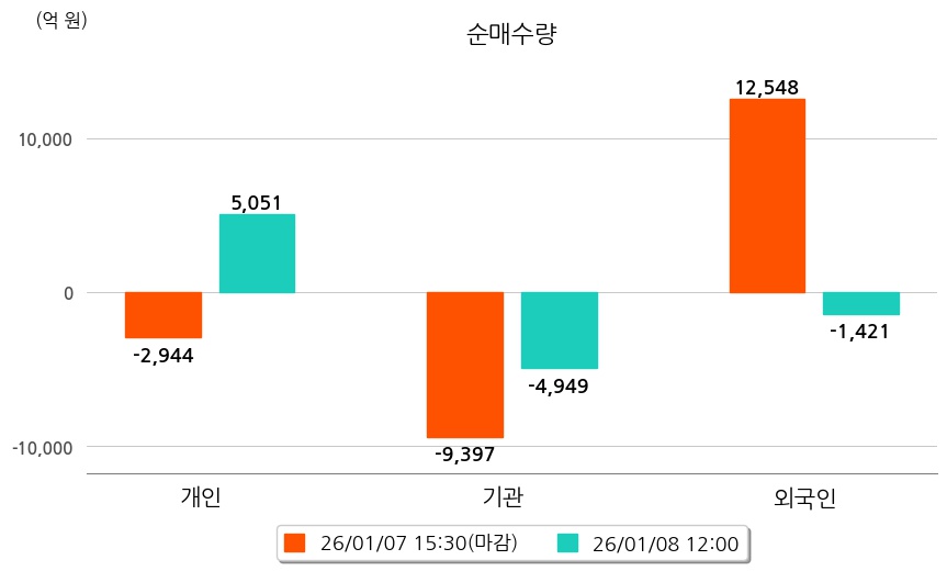 투자자별 동향을 살펴보면 기관은 4,949억 원 순매도했으며, 외국인은 1,421억 원 순매도했다. 개인은 5,051억 원 순매수했다.
