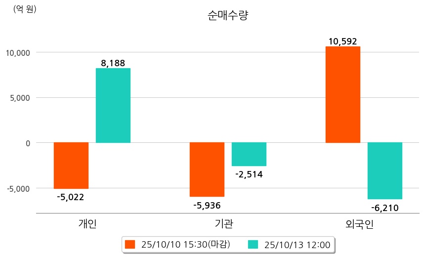 투자자별 동향을 살펴보면 기관은 2,514억 원 순매도했으며, 외국인은 6,210억 원 순매도했다. 개인은 8,188억 원 순매수했다.