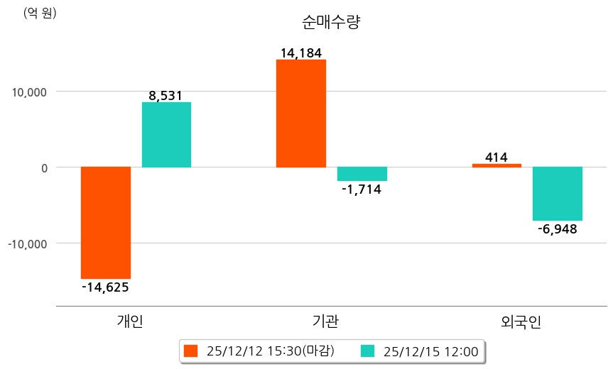 투자자별 동향을 살펴보면 기관은 1,714억 원 순매도했으며, 외국인은 6,948억 원 순매도했다. 개인은 8,531억 원 순매수했다.