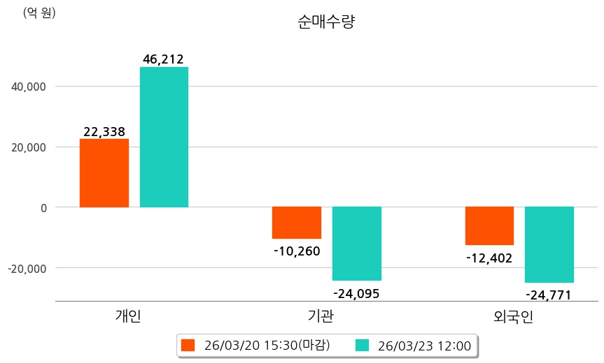 투자자별 동향을 살펴보면 기관은 24,095억 원 순매도했으며, 외국인은 24,771억 원 순매도했다. 개인은 46,212억 원 순매수했다.