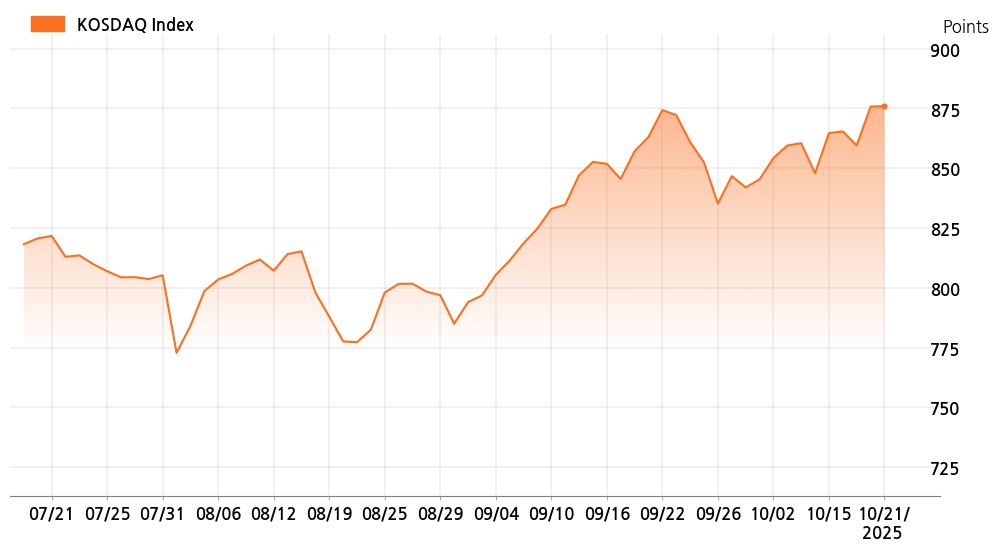 21일 정오 현재 코스닥(876.00p, 0.23p, +0.03%)는 개인 매수가 늘면서 상승세를 보이고 있다.