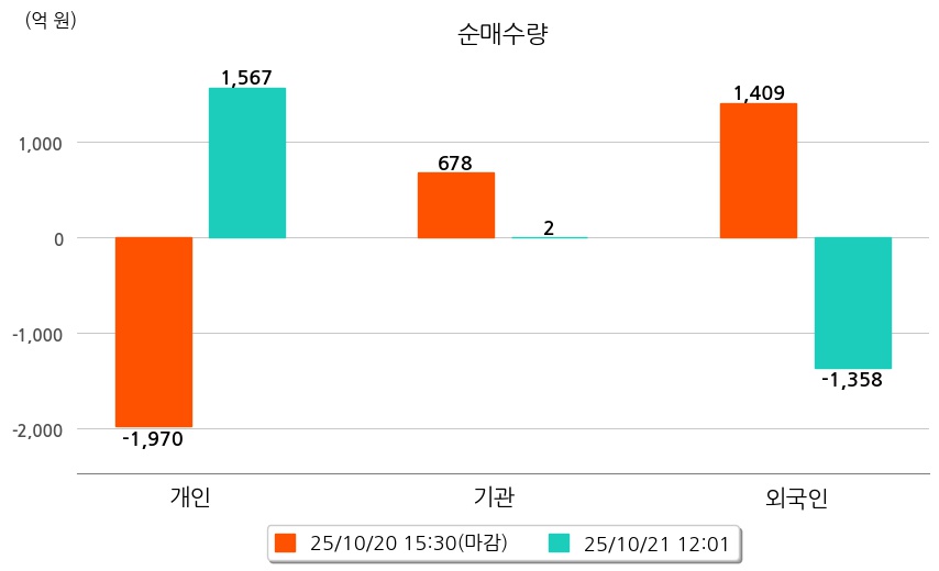 투자자별 동향을 살펴보면 기관은 2억 원 순매수했으며, 외국인은 1,358억 원 순매도했다. 개인은 1,567억 원 순매수했다.
