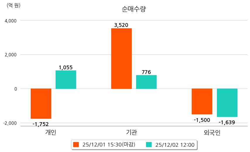 투자자별 동향을 살펴보면 기관은 776억 원 순매수했으며, 외국인은 1,639억 원 순매도했다. 개인은 1,055억 원 순매수했다.