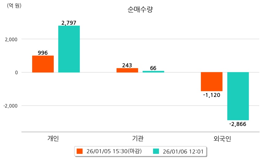 투자자별 동향을 살펴보면 기관은 66억 원 순매수했으며, 외국인은 2,866억 원 순매도했다. 개인은 2,797억 원 순매수했다.