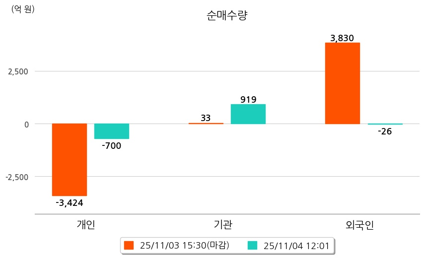 투자자별 동향을 살펴보면 기관은 919억 원 순매수했으며, 외국인은 26억 원 순매도했다. 개인은 700억 원 순매도했다.