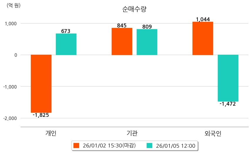 투자자별 동향을 살펴보면 기관은 809억 원 순매수했으며, 외국인은 1,472억 원 순매도했다. 개인은 673억 원 순매수했다.
