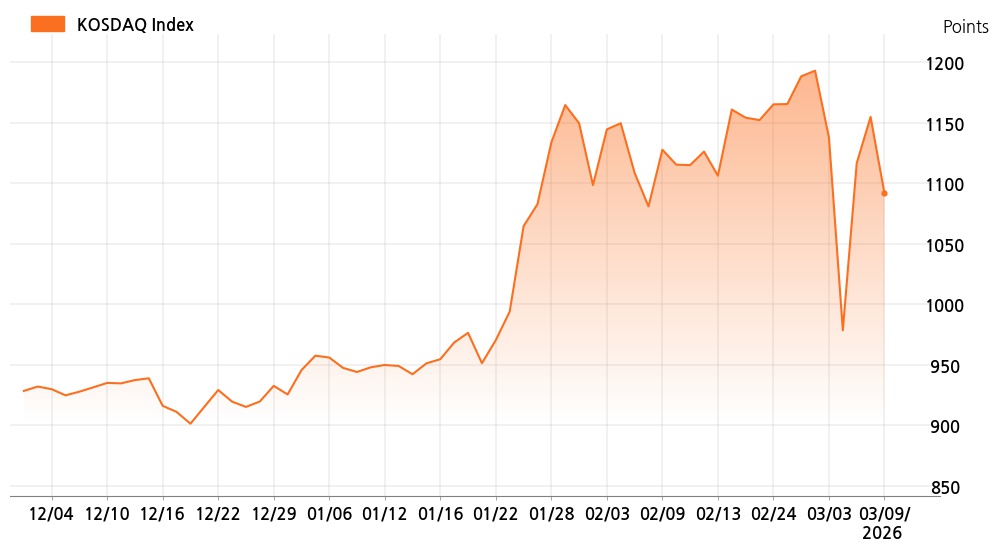 9일 정오 현재 코스닥(1,091.46p, 63.21p, -5.47%)는 외국인 매도가 늘면서 하락세를 보이고 있다.