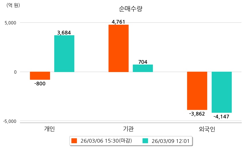 투자자별 동향을 살펴보면 기관은 704억 원 순매수했으며, 외국인은 4,147억 원 순매도했다. 개인은 3,684억 원 순매수했다.
