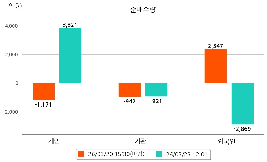 투자자별 동향을 살펴보면 기관은 921억 원 순매도했으며, 외국인은 2,869억 원 순매도했다. 개인은 3,821억 원 순매수했다.