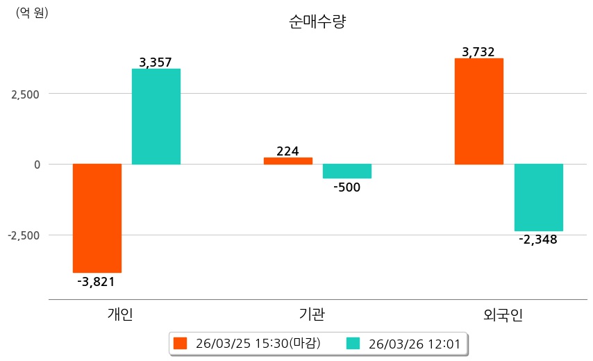 투자자별 동향을 살펴보면 기관은 500억 원 순매도했으며, 외국인은 2,348억 원 순매도했다. 개인은 3,357억 원 순매수했다.