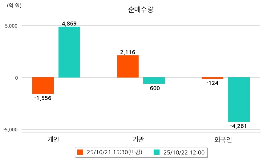 투자자별 동향을 살펴보면 기관은 600억 원 순매도했으며, 외국인은 4,261억 원 순매도했다. 개인은 4,869억 원 순매수했다.