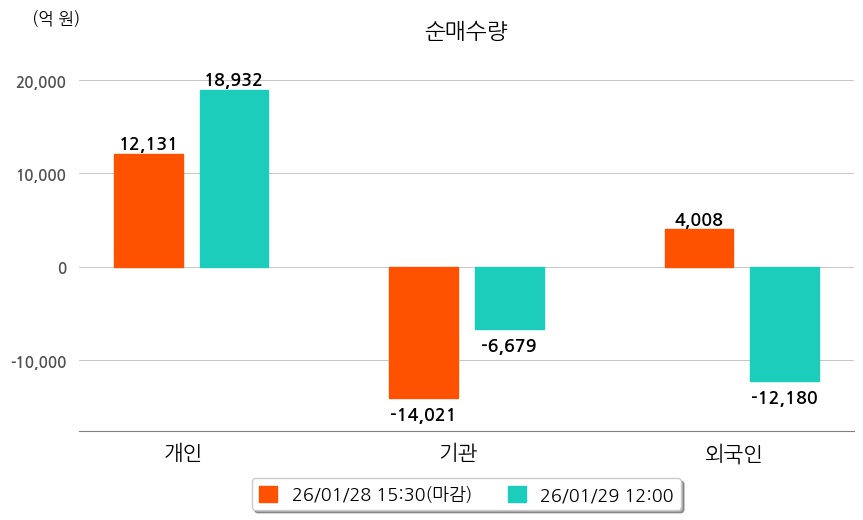 투자자별 동향을 살펴보면 기관은 6,679억 원 순매도했으며, 외국인은 12,180억 원 순매도했다. 개인은 18,932억 원 순매수했다.