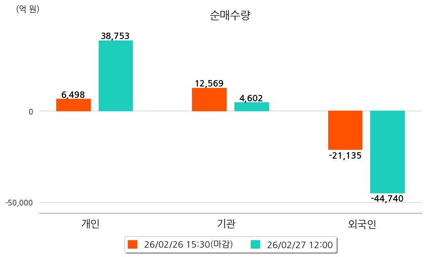 투자자별 동향을 살펴보면 기관은 4,602억 원 순매수했으며, 외국인은 44,740억 원 순매도했다. 개인은 38,753억 원 순매수했다.