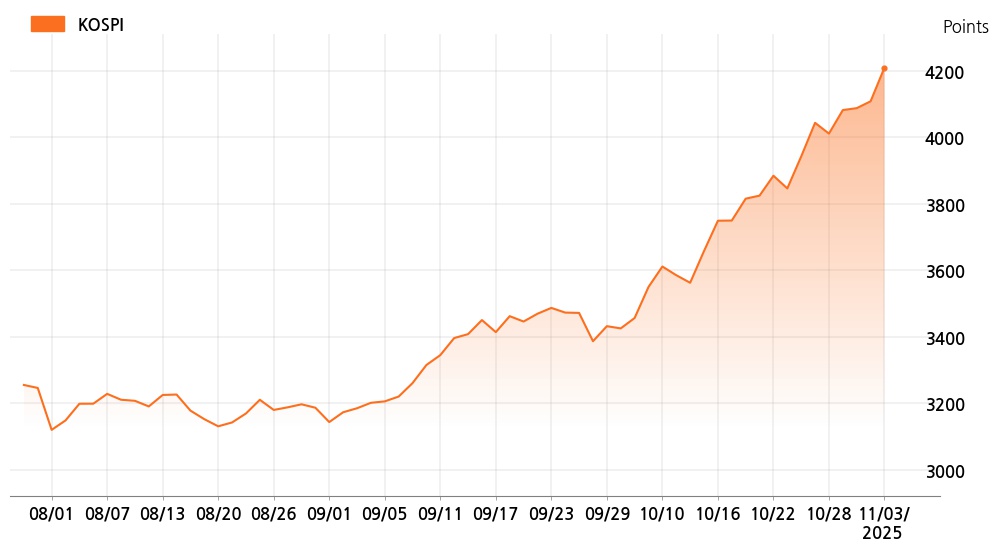 3일 정오 현재 코스피(4,208.80p, 101.30p, +2.47%)는 개인 매수가 늘면서 상승세를 보이고 있다.