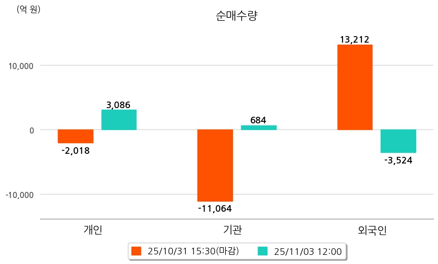 투자자별 동향을 살펴보면 기관은 684억 원 순매수했으며, 외국인은 3,524억 원 순매도했다. 개인은 3,086억 원 순매수했다.