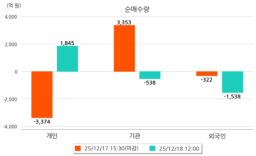 투자자별 동향을 살펴보면 기관은 538억 원 순매도했으며, 외국인은 1,538억 원 순매도했다. 개인은 1,845억 원 순매수했다.
