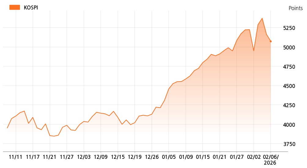 6일 정오 현재 코스피(5,075.22p, 88.35p, -1.71%)는 외국인 매도가 늘면서 하락세를 보이고 있다.